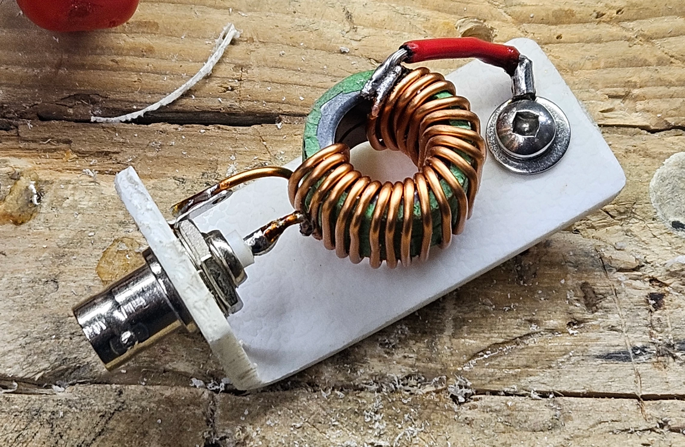 The transformer is the key to making this antenna successful. Essentially an L-Match, they typically use a Type 43 ferrite toroidal core wrapped with enamel coated wire. Recent experimental work has been done with other core types too, including 52 and 61. Also, new core geometry has been found to provide incredible efficiencies of over 90%. The other component needed for this antenna matching circuit is a 100-120pF capacitor.