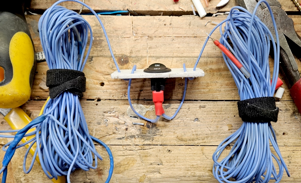 I had some 22 AWG silicone wire from BNTECH go that I had previously used for a 40M EFHW. I cut it in half and installed some female spade connectors. I crimped and soldered and double glue-shrink wrapped them for spite.