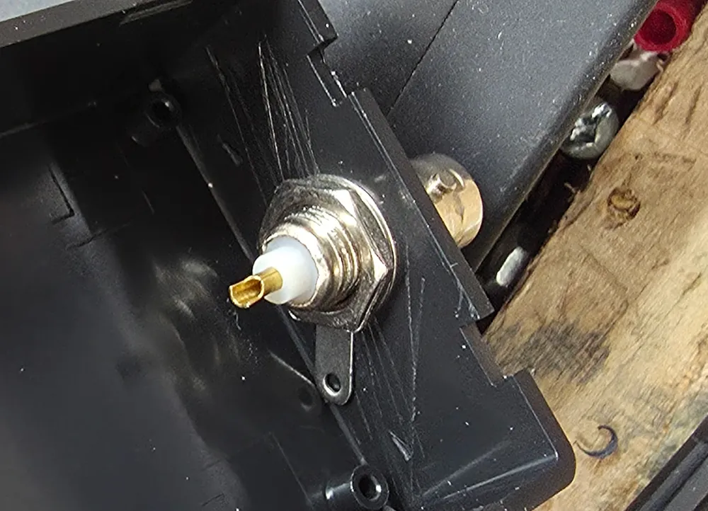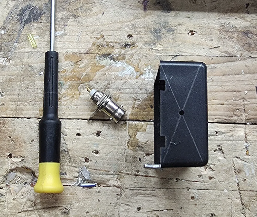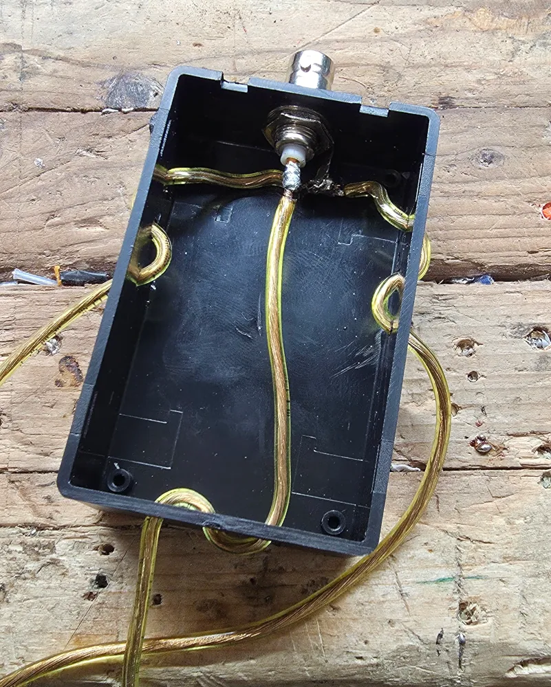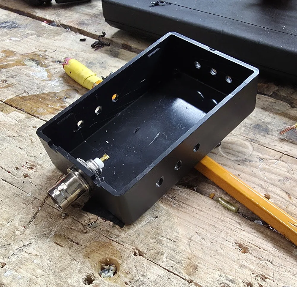 I ordered some el-cheapo plastic project boxes from Amazon. The lids just pop off with a screwdriver. Definitely not weather sealed. But for this temporary antenna it’s just fine. The main goal of the box is to provide a decent amount of strain relief for the wire. I drilled it out for a BNC connector and strain relief holes.