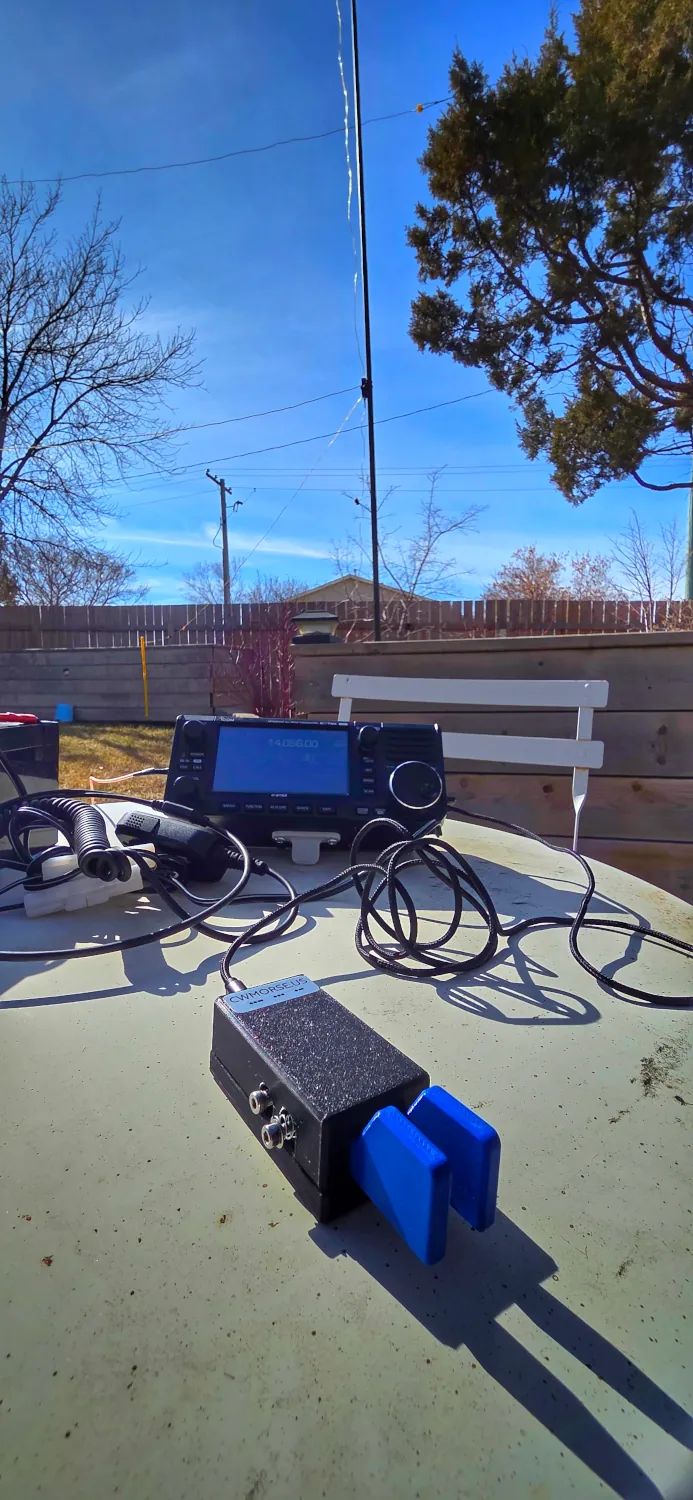 I decided to make a Vertical Tri-Band antenna using my snazzy antenna links. This vertical has two raised & tuned ground radials. It’s basically a ripoff of the KJ6ER POTA PERformer antenna but is linked for the 15M, 17M and 20M bands. This is a decent solution if you don’t have an antenna whip (which I still don’t).