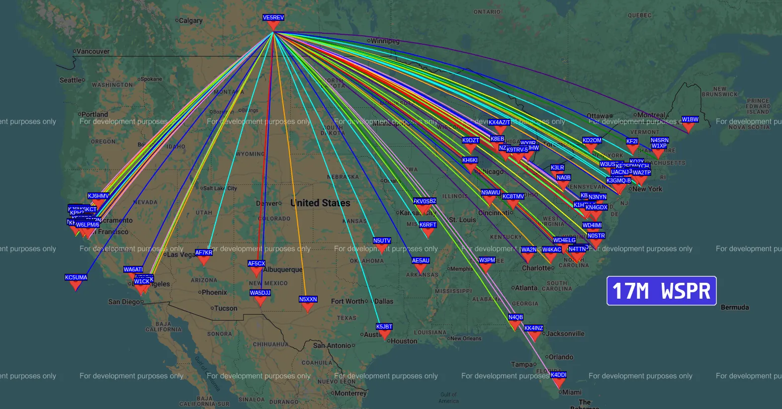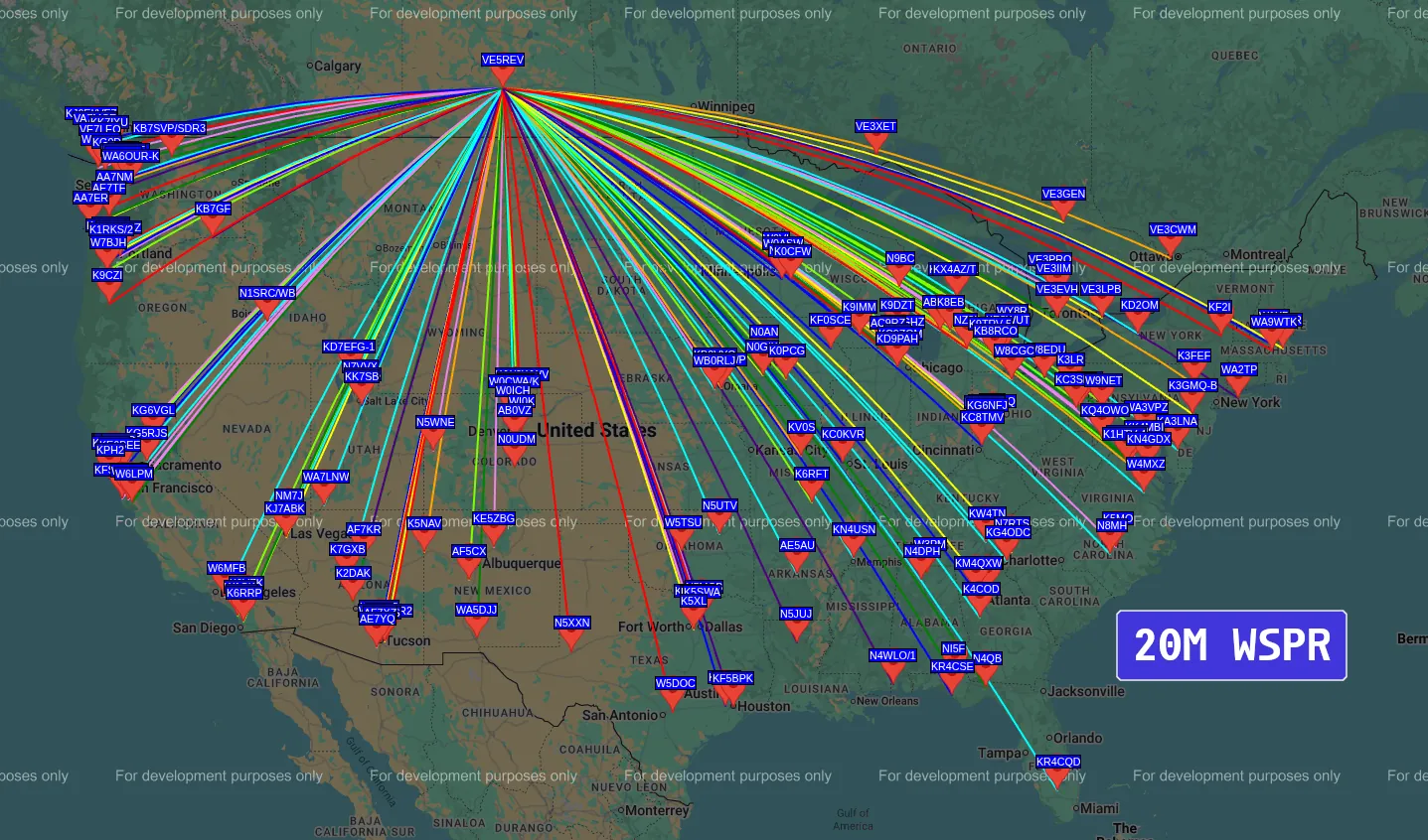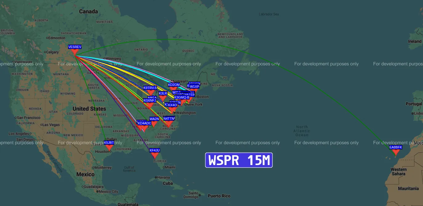 All of the WSPR tests were performed at 1 Watt for 20 minutes. Antenna was deployed with the radials facing south, approximately 45° angle.